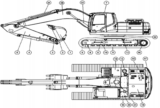 4. Kepçe Silindiri 13. Taşıyıcı Makara 22. Kule Döndürme Dişlisi